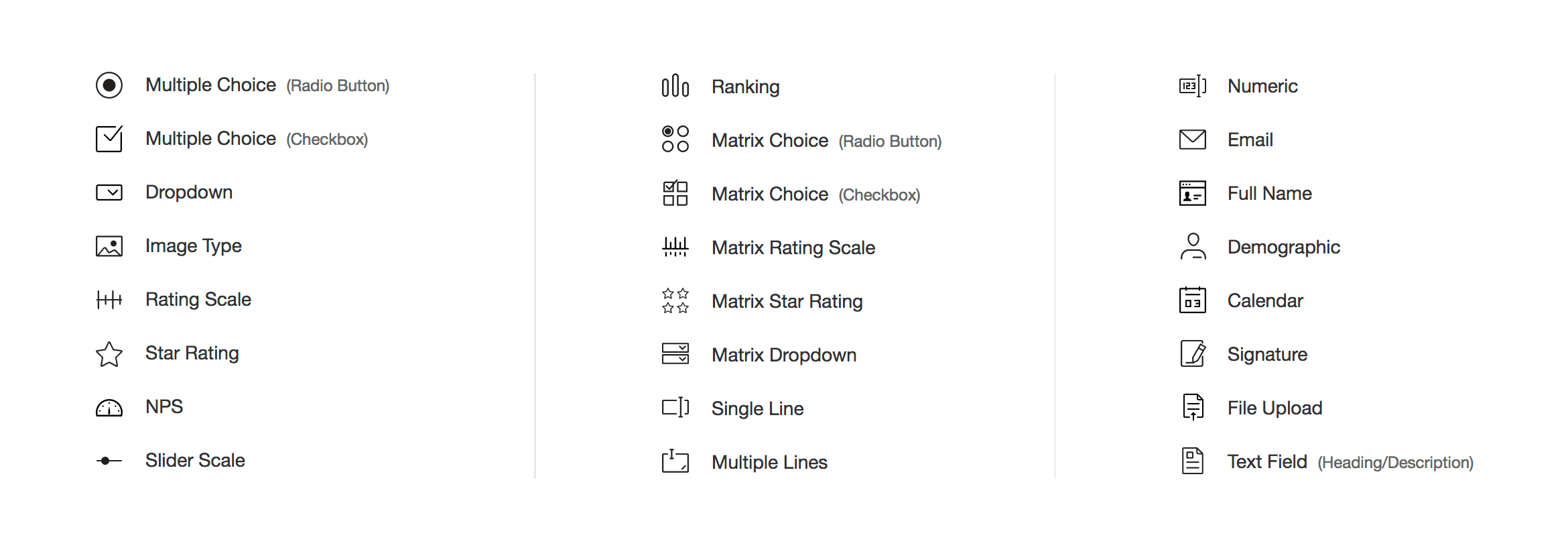 With over 25 distinct question kinds available, your participants' responses will always be in the format you want.